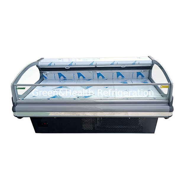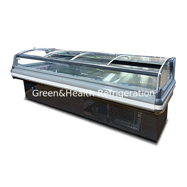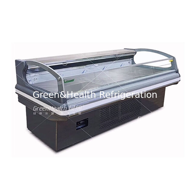1Die Schaufenster mit frischem Fleisch im europäischen Stil verfügen über ein schlankes, modernes Design, das von der europäischen Ästhetik inspiriert ist.mit gekrümmten Glasplatten und minimalistischen Rahmen, die visuelle Anziehungskraft in Einzelhandelsumgebungen erhöhen und gleichzeitig die Produktsichtbarkeit maximieren.